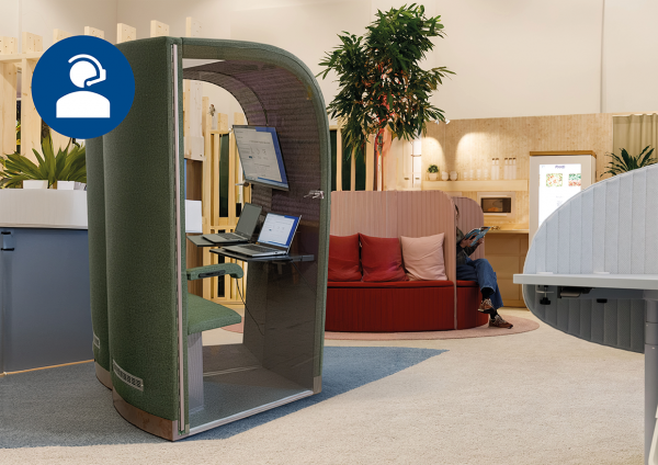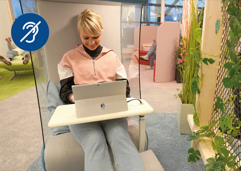 Impulse sacken lassen, Notizen machen oder konzentriert planen: der akustisch abgeschirmte Sessel bietet eine perfekte Arbeitsmöglichkeit. Denn, die Ein-Quadratmeter-Telefonzelle braucht kein Mensch.