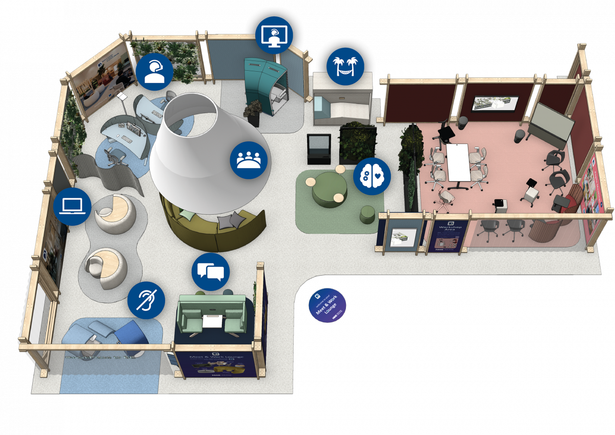 Warum workPlaces to BE echte Gamechanger für die Arbeit der Zukunft sind, erklären wir nicht nur im Vortrag. Als Gastgeber der Meet & Work Lounge schaffen wir vor Ort einen kleinen Ausschnitt einer solchen Arbeitswelt – zum anfassen, zum erleben, zum ausprobieren. Wir zeigen Proven Practise und zeigen anschaulich, warum Raum ein strategisches Werkzeug für die Transformation ist. Reserviere gleich einen Arbeitsplatz!