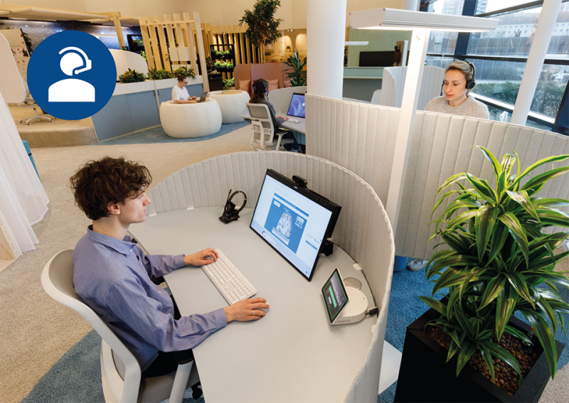 Klassische Arbeitsplätze für Arbeit von 9-5 haben keine Zukunft. Perfektes Desksharing geht so: USB-C Stecker anschließen und loslegen: In Ruhe arbeiten oder Online-Meeting dank Schutz im Rücken.